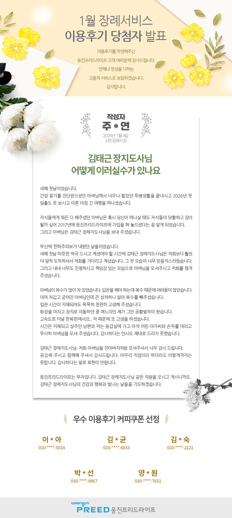 [발표] 2026년 1월 장례서비스 우수 이용후기 선정