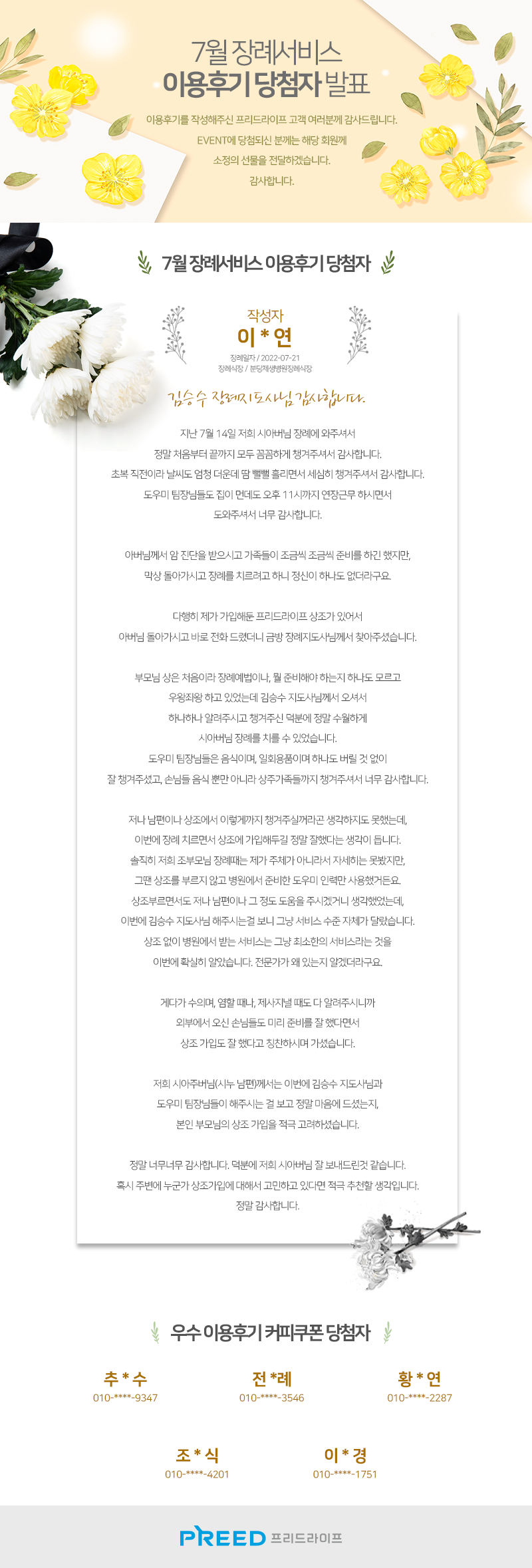 [발표] 7월 장례서비스 우수 이용후기 선정