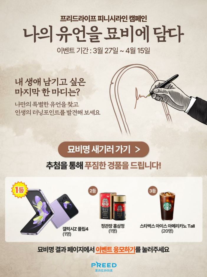 특별한 유언도 새겨보시고, 이벤트 응모를 통해 푸짐한 경품도 받아 가세요!
