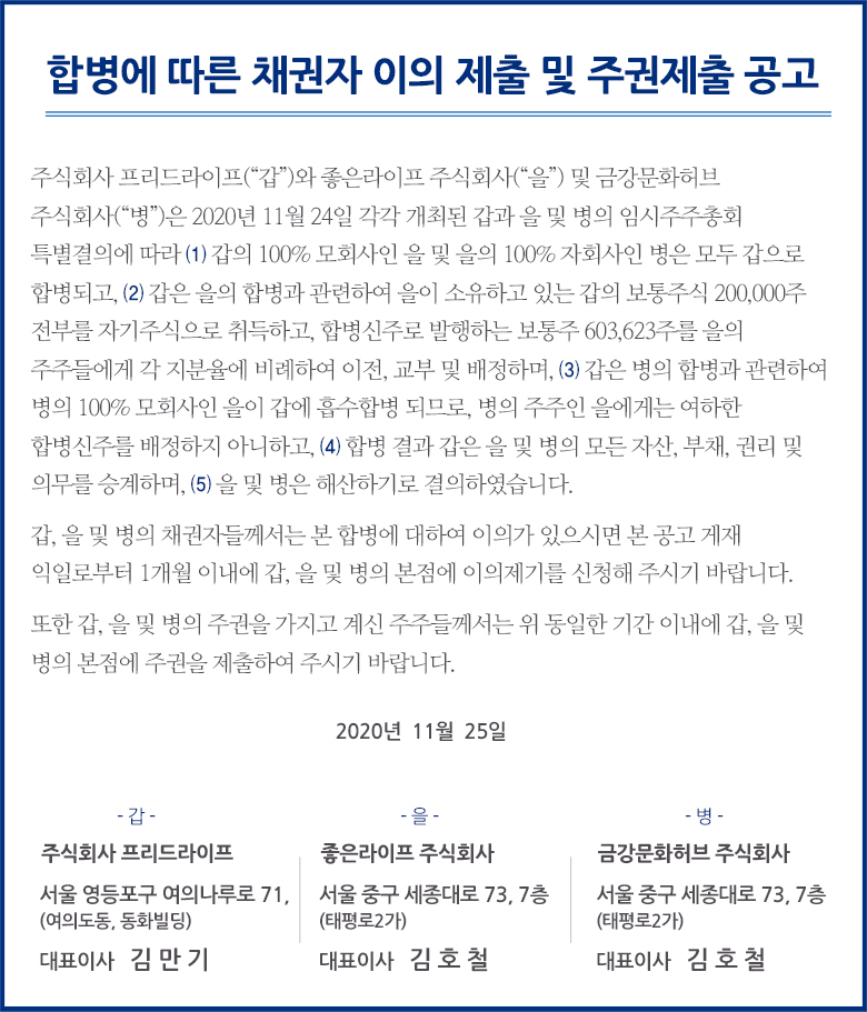 [안내] 합병에 따른 채권자 이의 제출 및 주권제출 공고